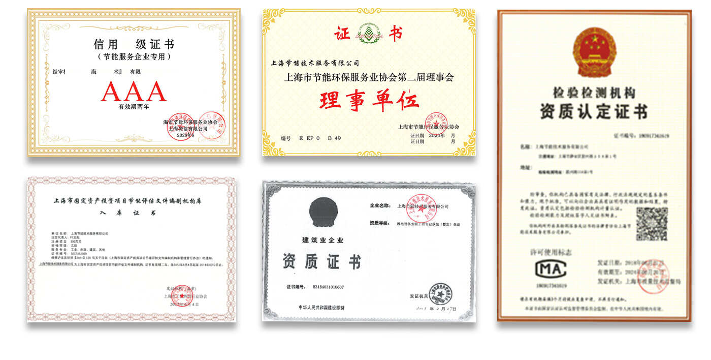 計量認證證書、上海市固定資產投資項目節能評估文件編制機構庫入庫證書、上海市節能服務機構備案證書、上海市清潔生產審核機構、信用等級證書(AAA)、上海市節能環保服務業協會理事單位